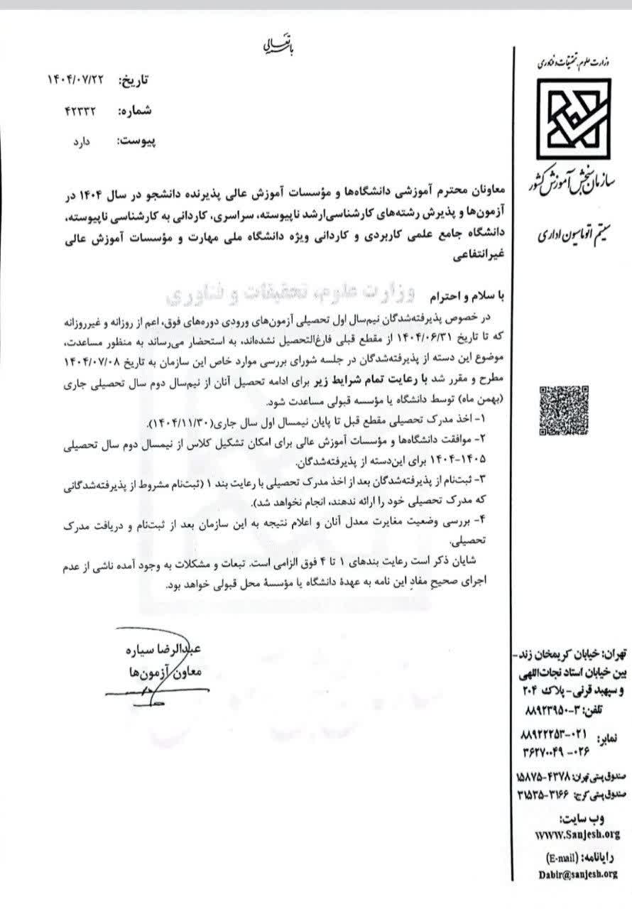 اطلاعیه سازمان سنجش در خصوص پذیرفته شدگانی که موفق به اخذ مدرک تحصیلی مقطع قبل تا پایان شهریور 1404 نشده اند